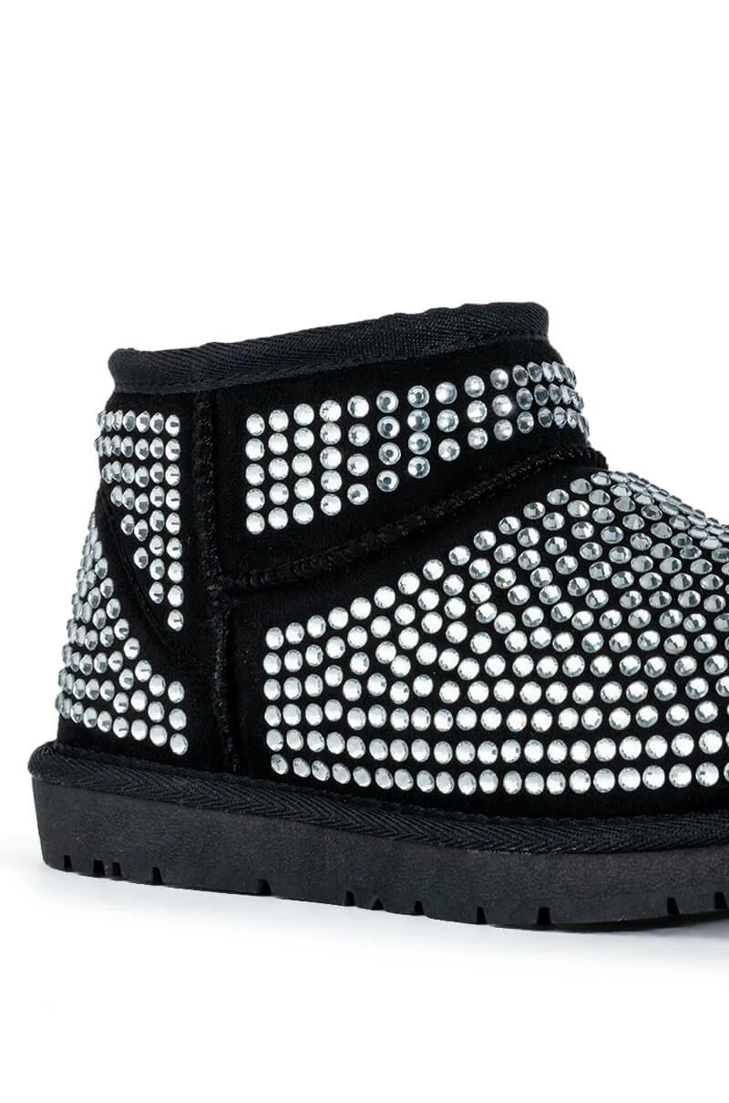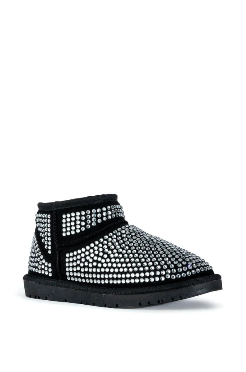 Add some whimsy to your cool weather wardrobe with The AKIRA Label Fairytale Bling Bootie In Black. This super soft and structured faux suede ankle boot features a faux fur lining, an ankle height shaft, a rounded toe, and glittering rhinestone detailing throughout. Wear with your favorite distressed denim and knits to this fall.