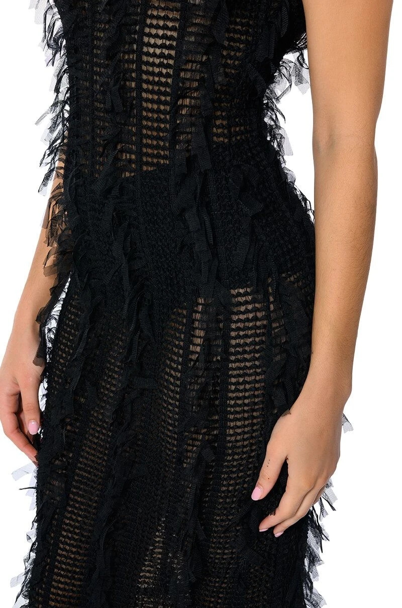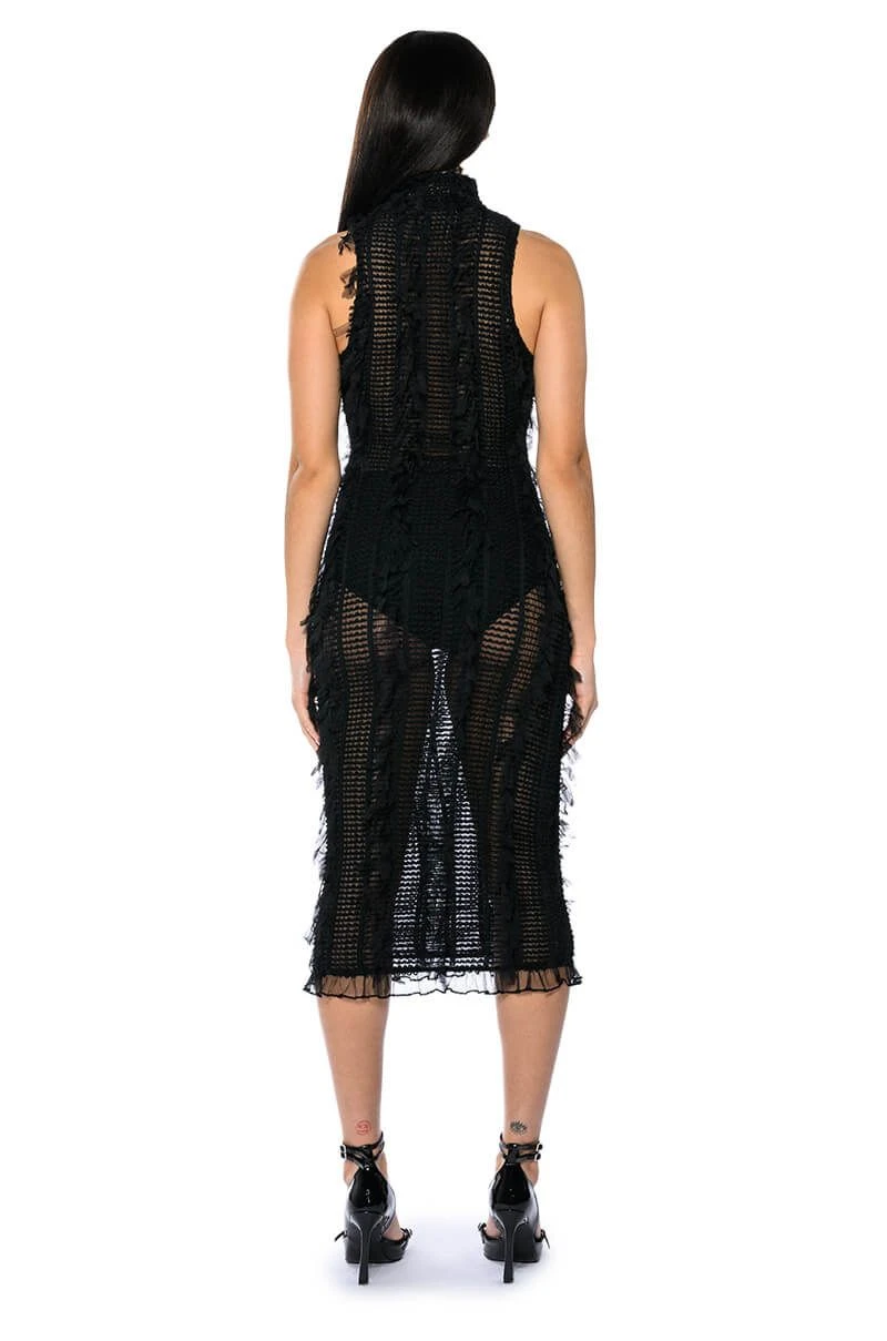 The AKIRA Label Backstage Shredded Midi Dress is made from a stretchy sheer mesh fabrication and features textured netting with fringe column body detailing, a ruffled mock neckline, a sleeveless design, a bodycon fit, a slip-on fit, a ruffled hem, and a midi length silhouette.