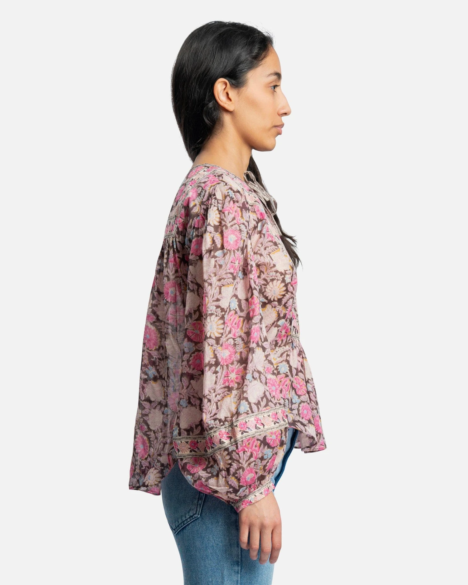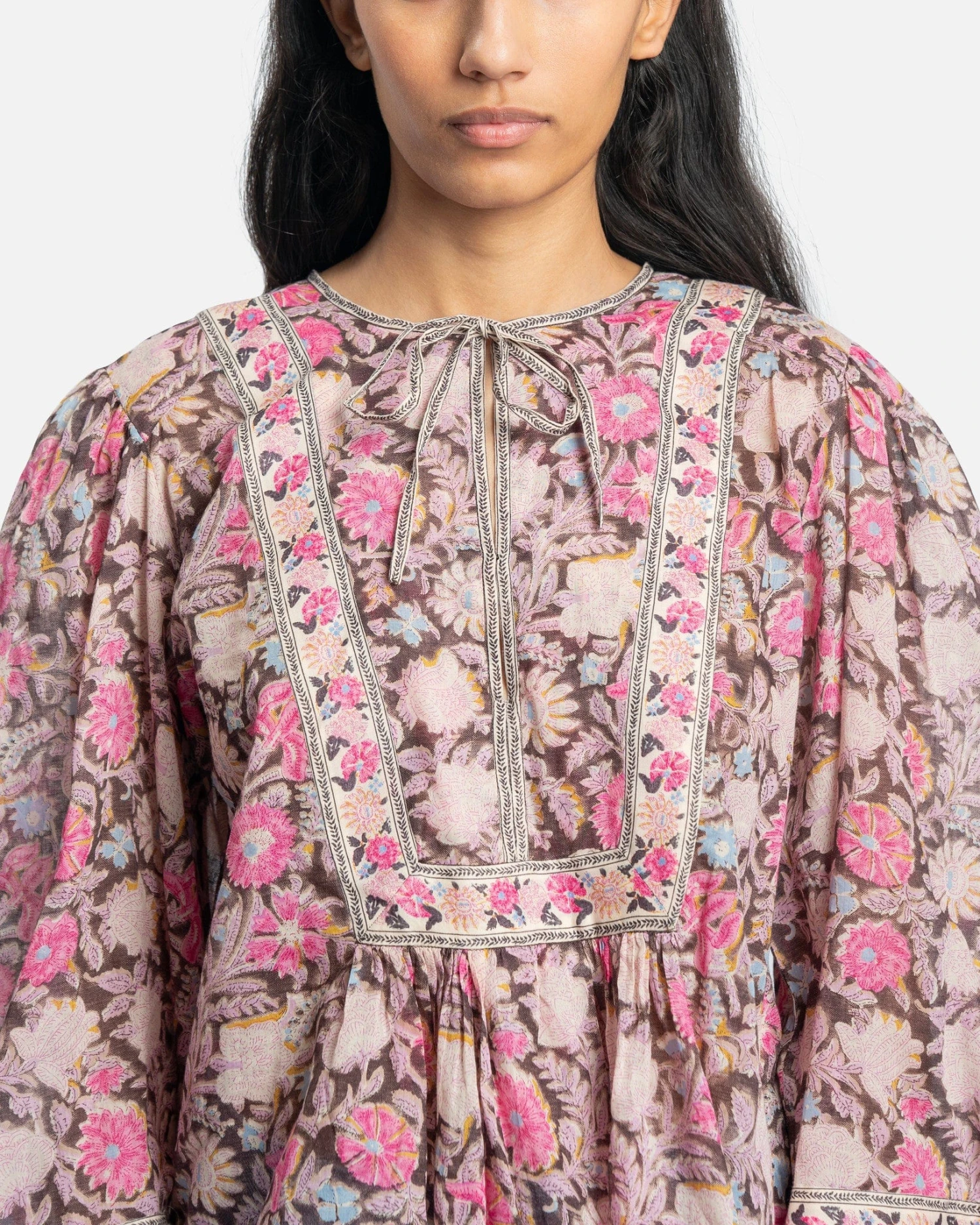Isabel Marant women’s floral printed top in pink. This blouse features a split neckline with tie closure and balloon sleeves. There is patterned trim details along the chest.