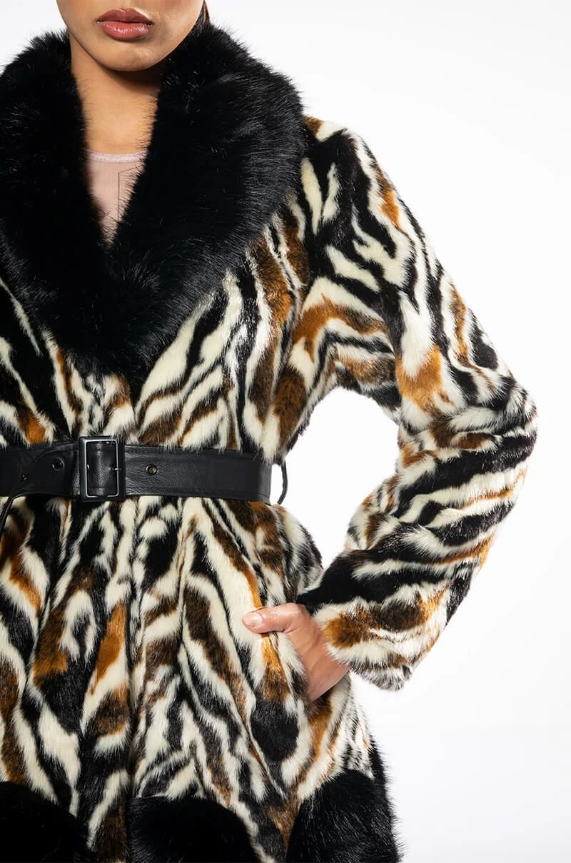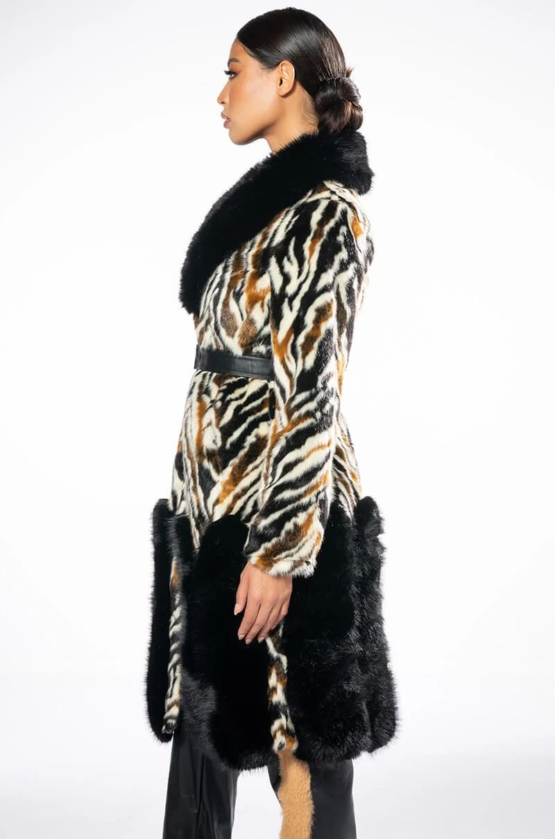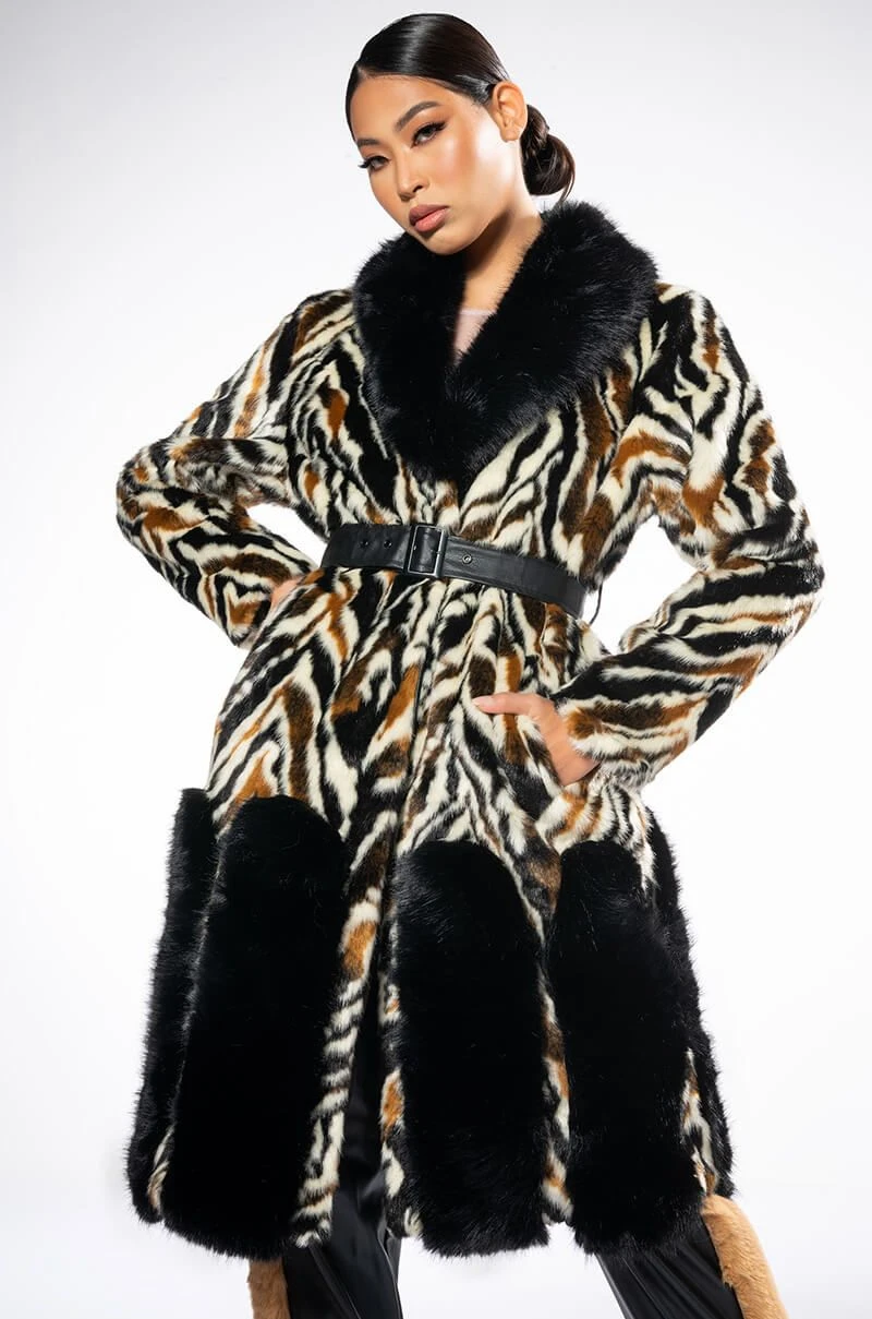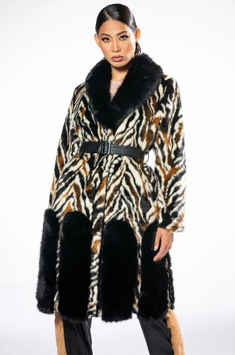 The AKIRA Label Luxe Zebra Faux Fur Coat is made from a bold zebra print faux fur fabrication and features a plush shawl collar, long sleeves, slant side pockets, an adjustable vegan leather waist belt, light polyester lining, and plush faux fur paneling along the hem. Complete with snap button front closures.