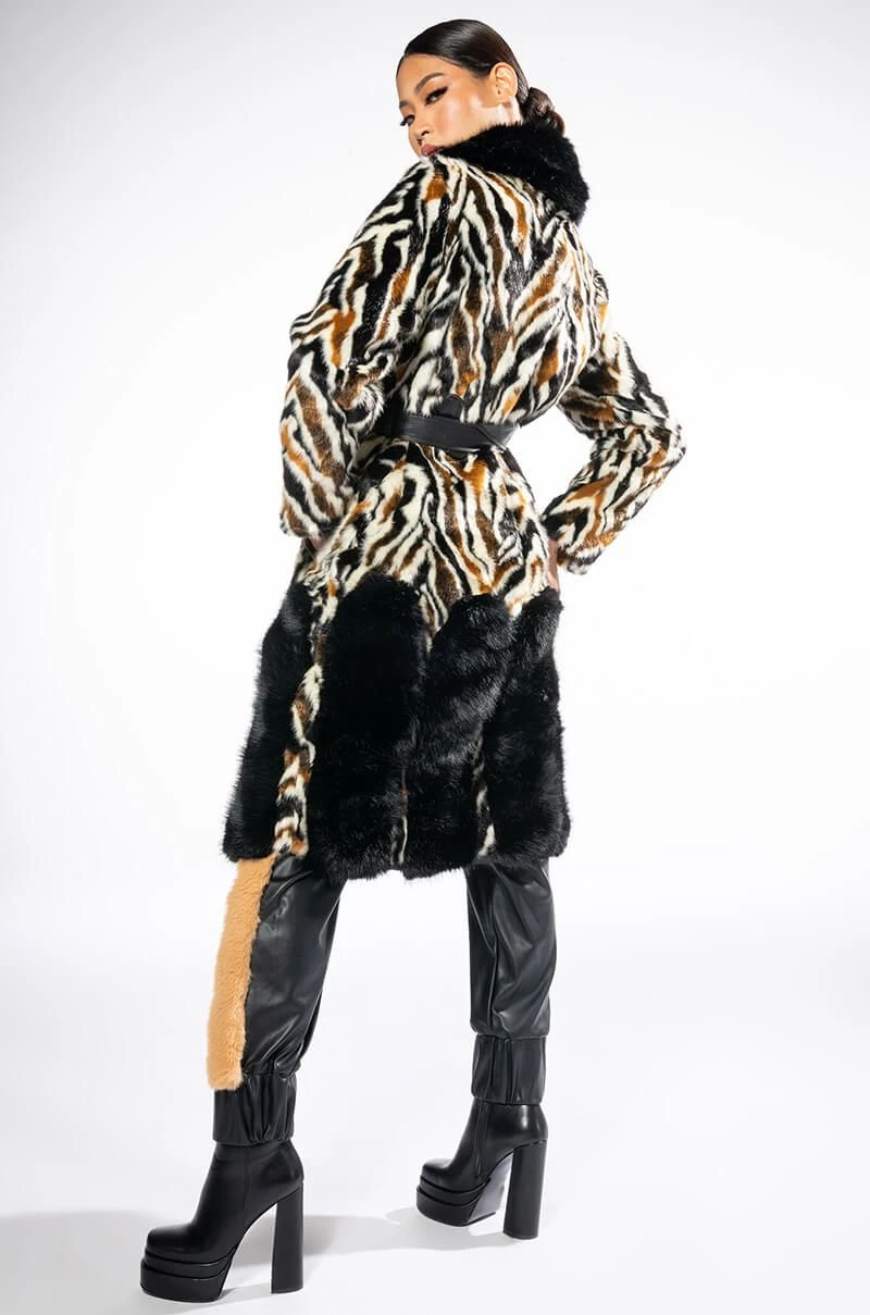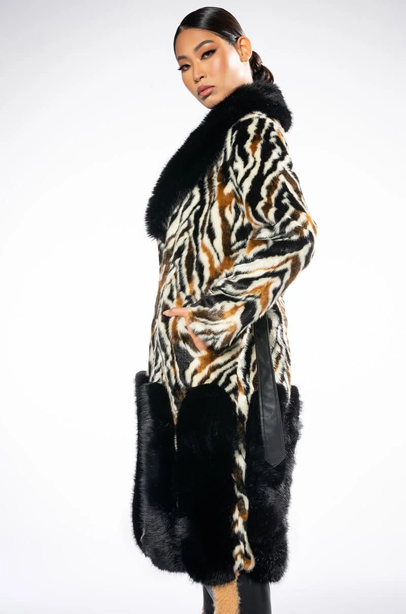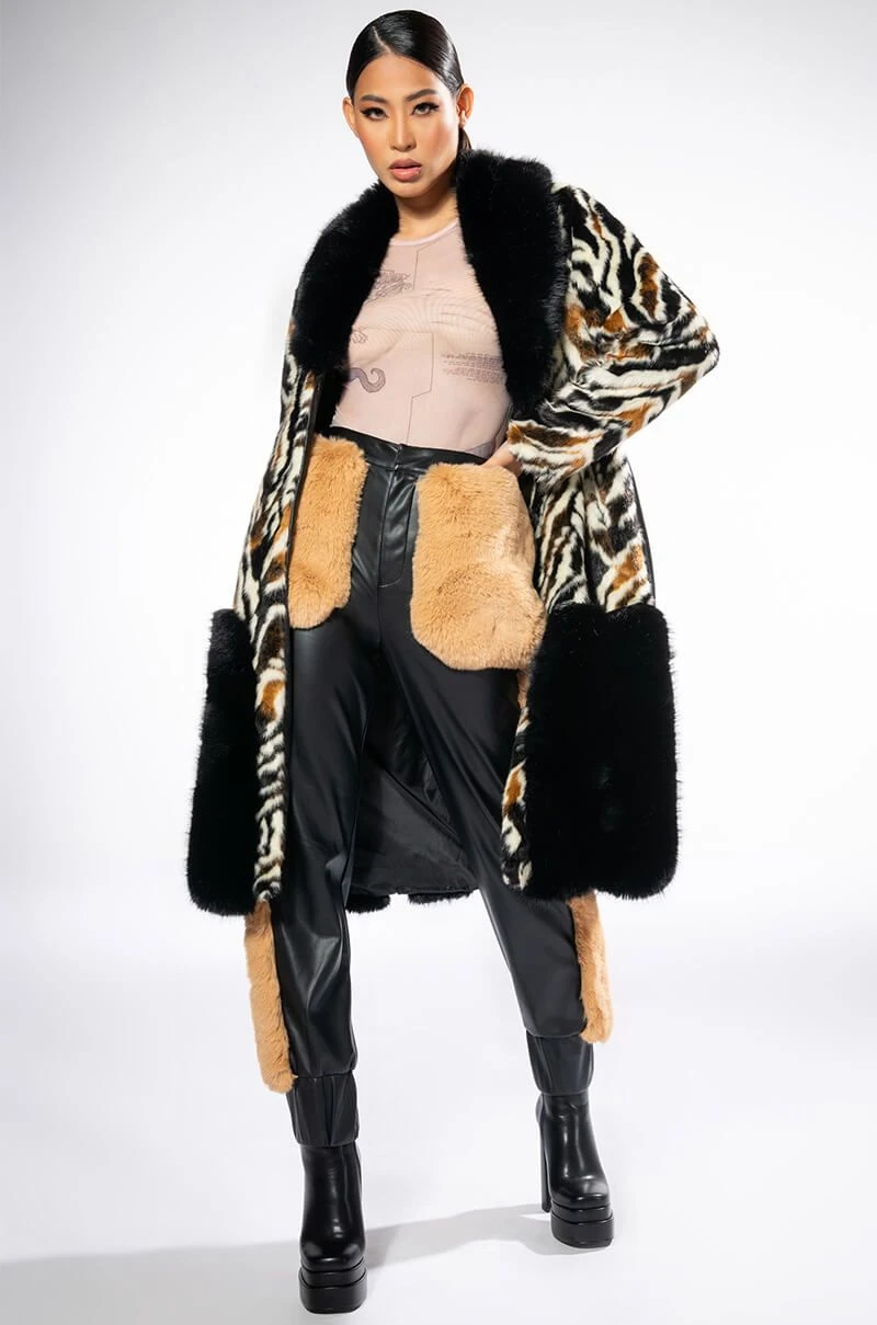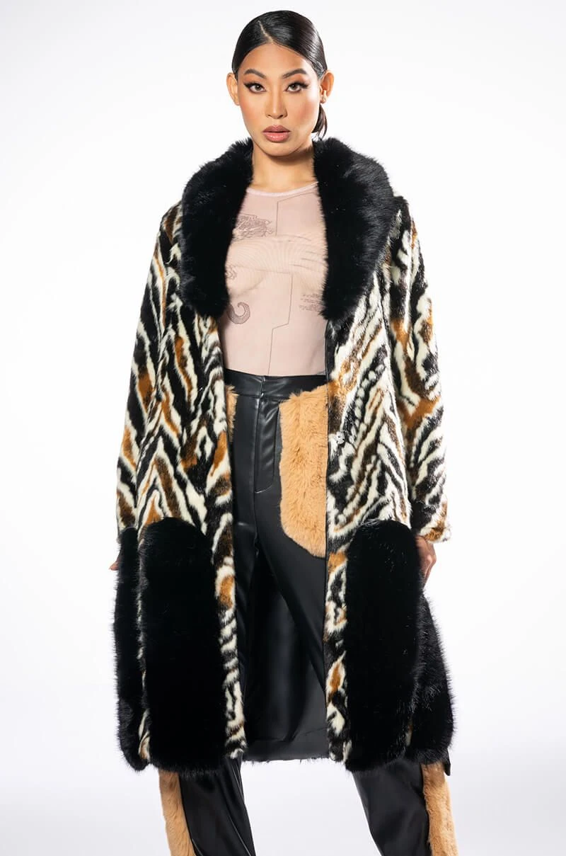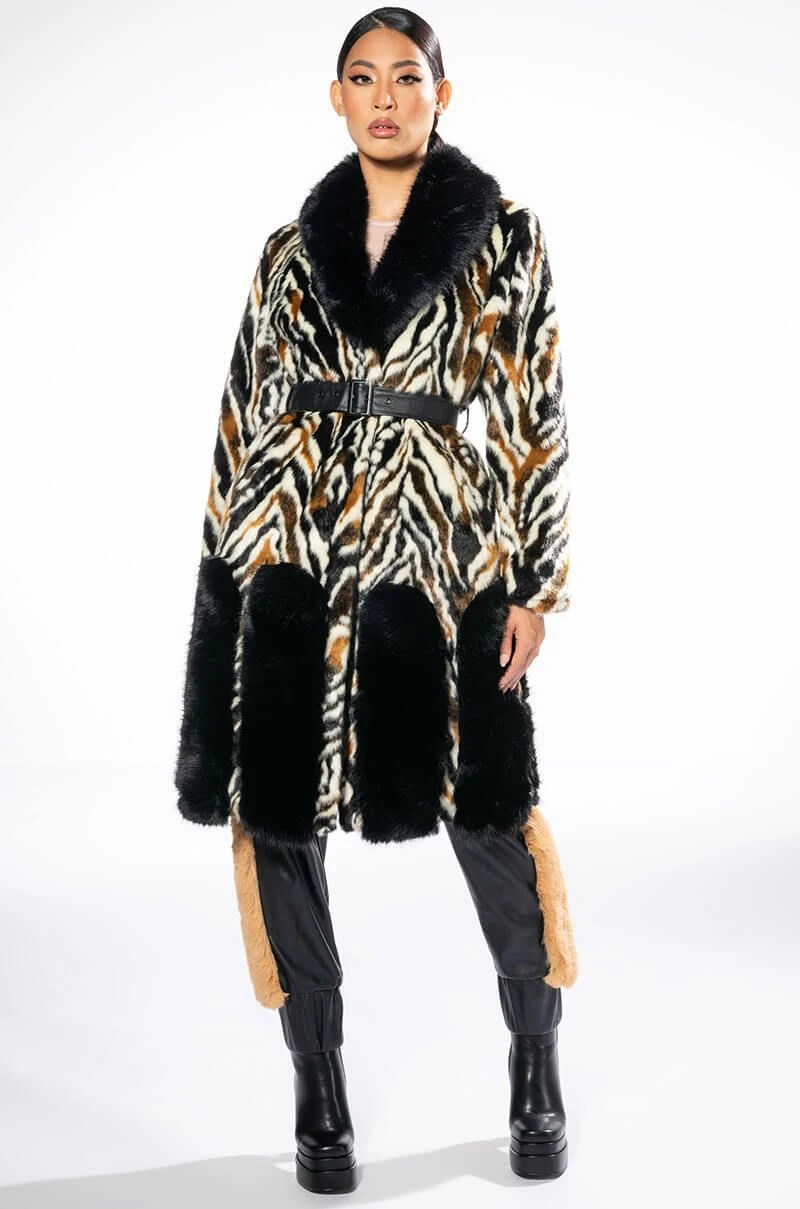 The AKIRA Label Luxe Zebra Faux Fur Coat is made from a bold zebra print faux fur fabrication and features a plush shawl collar, long sleeves, slant side pockets, an adjustable vegan leather waist belt, light polyester lining, and plush faux fur paneling along the hem. Complete with snap button front closures.