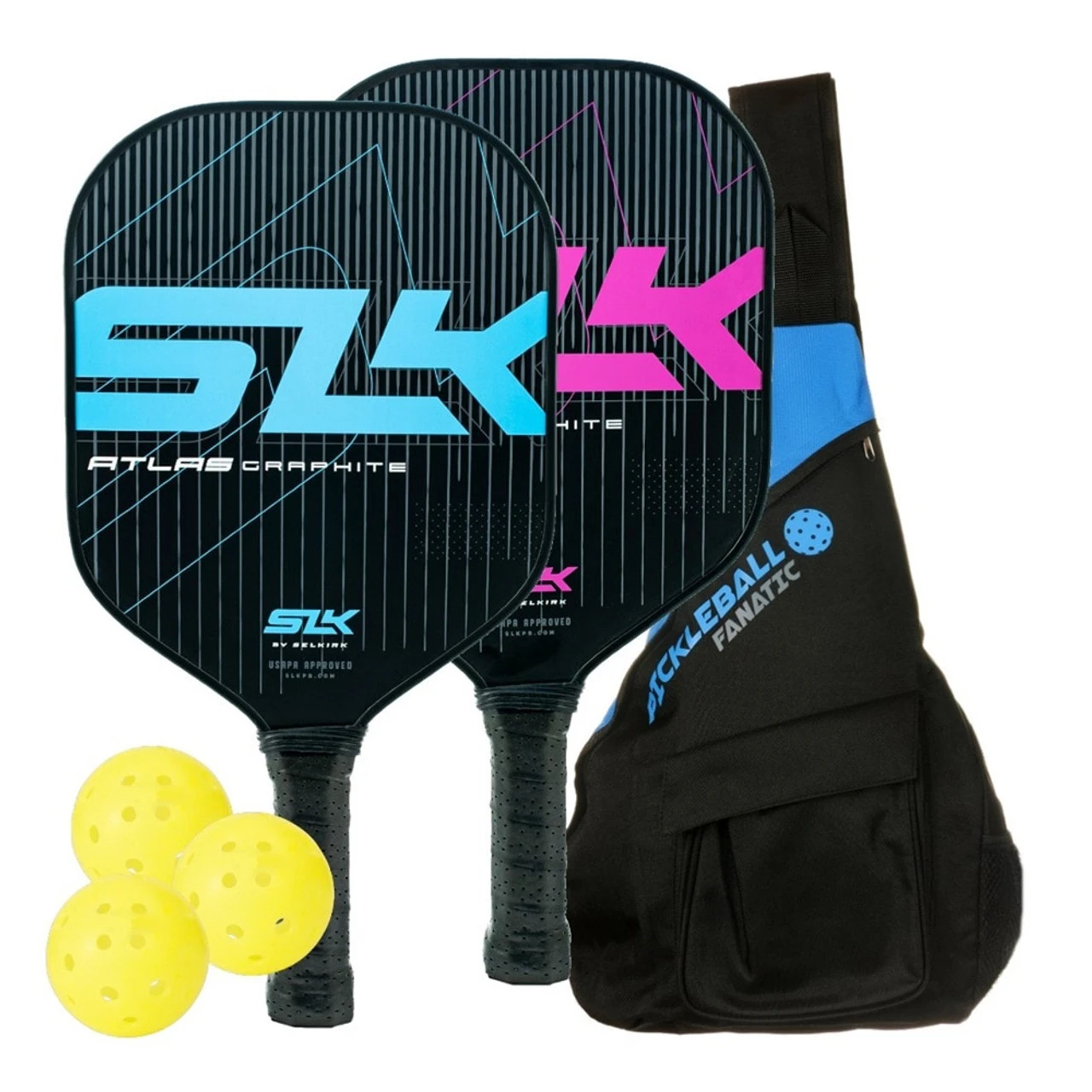 The SLK Atlas Two Paddle Bundle arrives with all the basics for you and a partner to hit the courts with confidence. This graphite paddle bundle features two quality SLK Atlas Paddles by Selkirk (one of the top names in pickleball paddle manufacturing), plus three outdoor pickleballs, and a blue “Pickleball Fanatic” Sling-style bag to keep it all together. The Atlas paddles have an 8.25″-wide face, enabling you to block with ease as well as make use of the large sweet spot. Created with a double-layered graphite face, these SLK paddles provide a great sense of “touch” which is supplemented by the sturdy polymer cores.