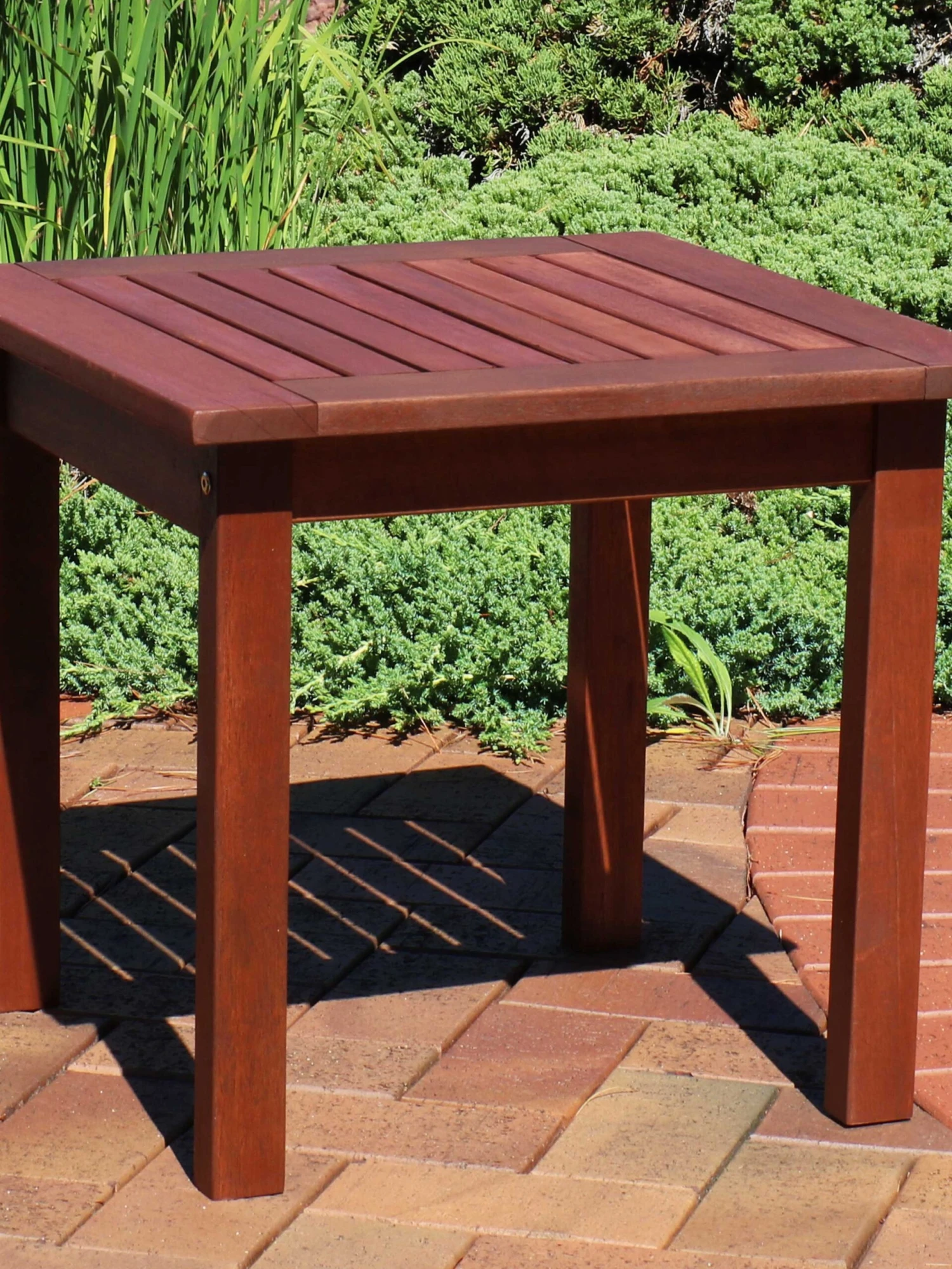 Enjoy being outdoors in the fresh air with this wooden side table. Made of elegant yet durable meranti wood, this stylish table features a contemporary design that complements any outdoor decor. The table is finished with a mahogany teak oil finish to protect the wood from most weather conditions and bring out the wood’s natural beauty.