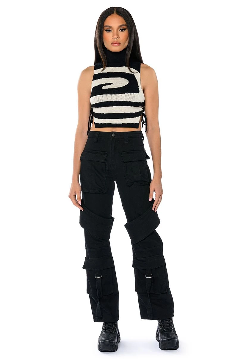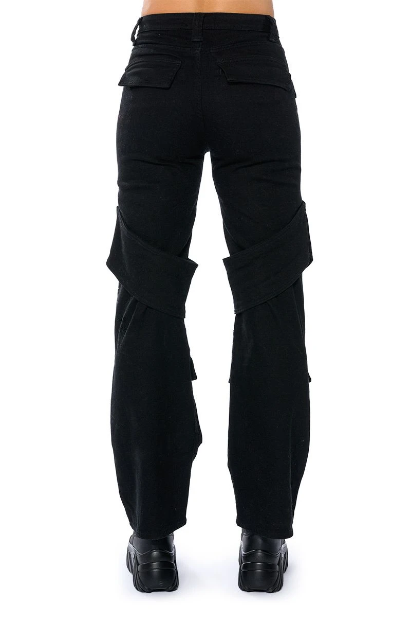 The AKIRA Label Too Cool Cargo High Waisted Jeans are a 2023 denim essential. Made with a structured cotton blend fabrication, these cargo pants feature a high-waisted, wide-leg design, deep front cargo flap pockets, and buckled cargo flap pockets at the bottom hems. Complete with wide utility bands around the thighs, back flap pockets, and a classic zip-up button closure. Pair with a long sleeve turtleneck and chunky platform boots for a sleek look.
