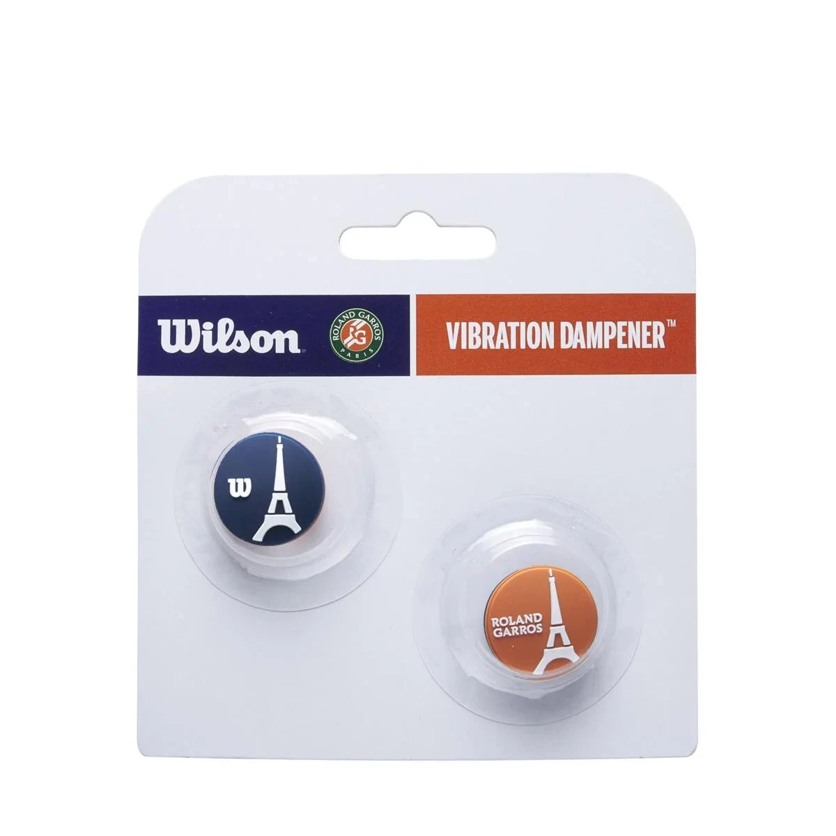 Garros inspired anti-vibrators, a pack of Roland Garros inspired anti-vibrators that effectively absorb shock and reduce vibration when balls hit the strings. The pack includes two anti-vibrators with an eiffeil tower graphic. The first orange one is printed Roland Garros while the second, blue, is printed Wilson.
