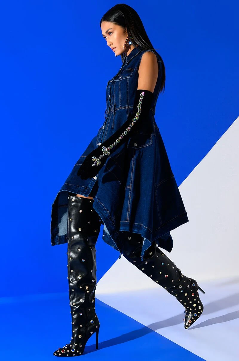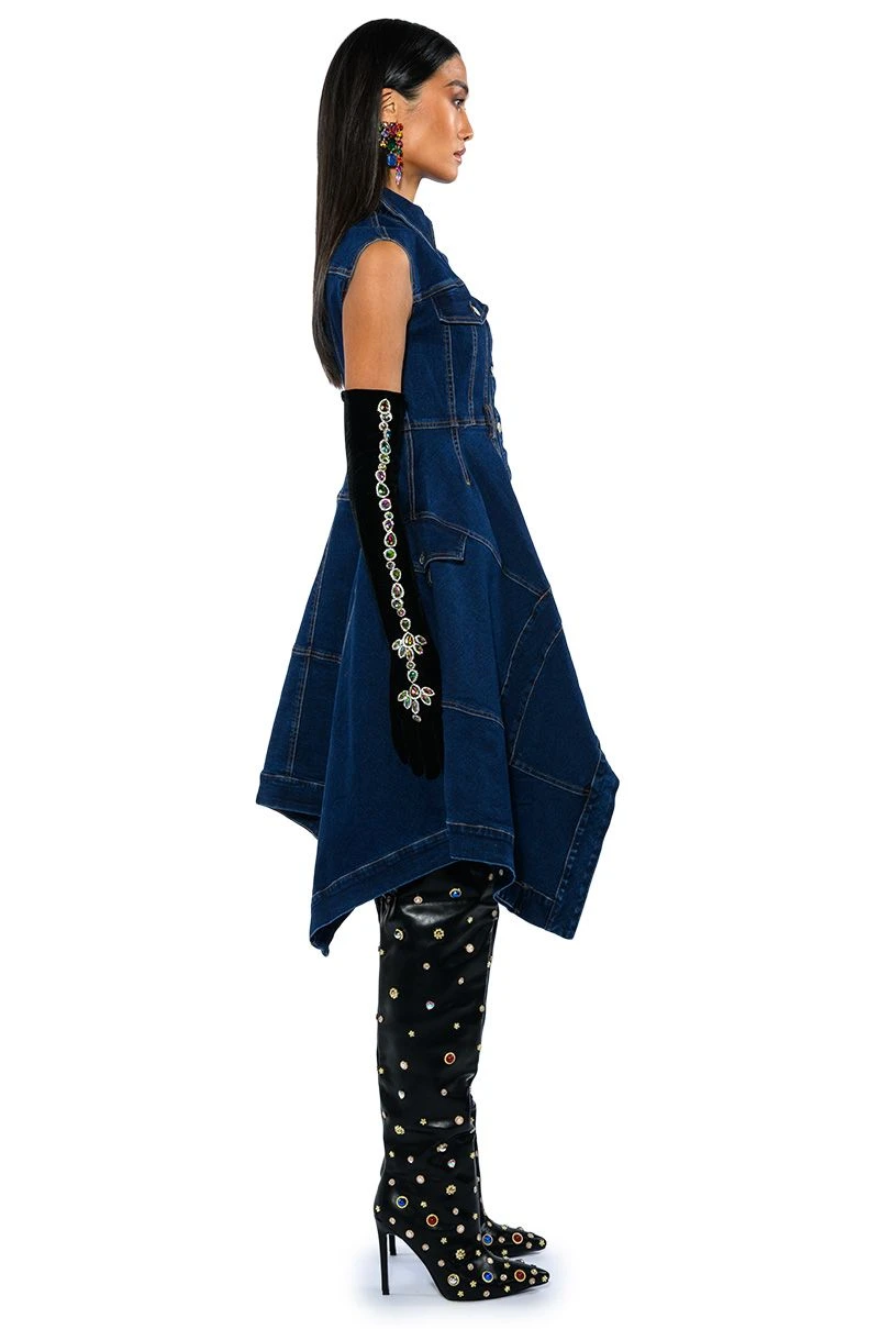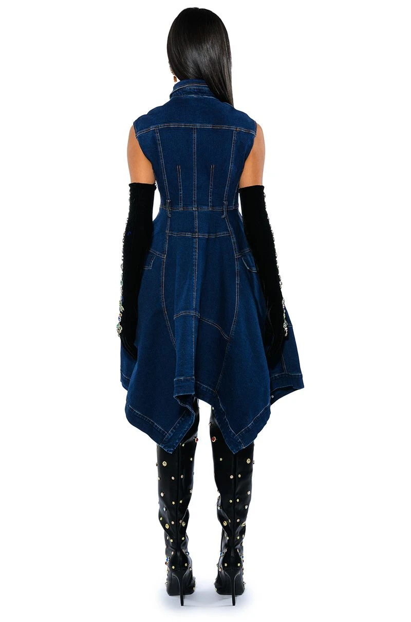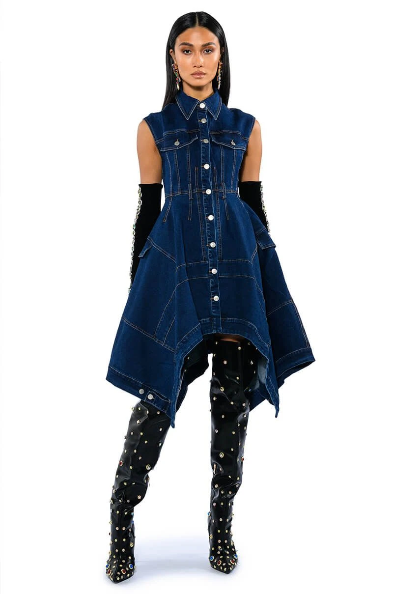 The AKIRA Label Winona Cap Sleeve Button Down Denim Midi Dress is made from a stretchy denim fabrication and features a collared neckline, cap sleeves, mock button flap chest pockets, contrast stitching, waist belt loops, mock side button flap pockets, a handkerchief hem, and a button down front closure.